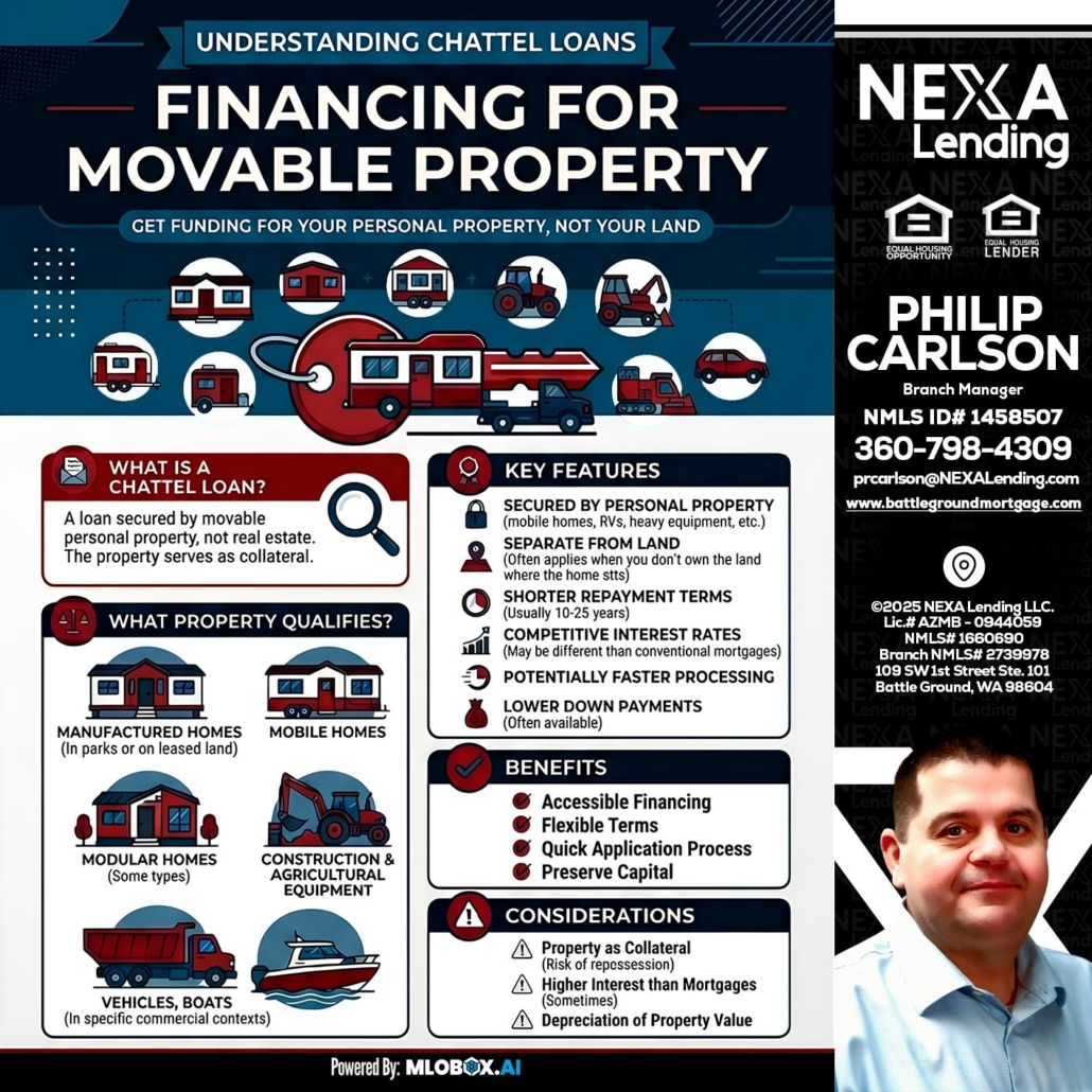 Chattel Loans - Philip Carlson -Branch ManagerHi, my name is Philip Carlson. I’m a Loan Officer offering personalized mortgage solutions, fast customized quotes, great rates and service with integrity. If you’re interested in learning more about the Chattel loan or any other, just let me know and I’ll walk you through your options.