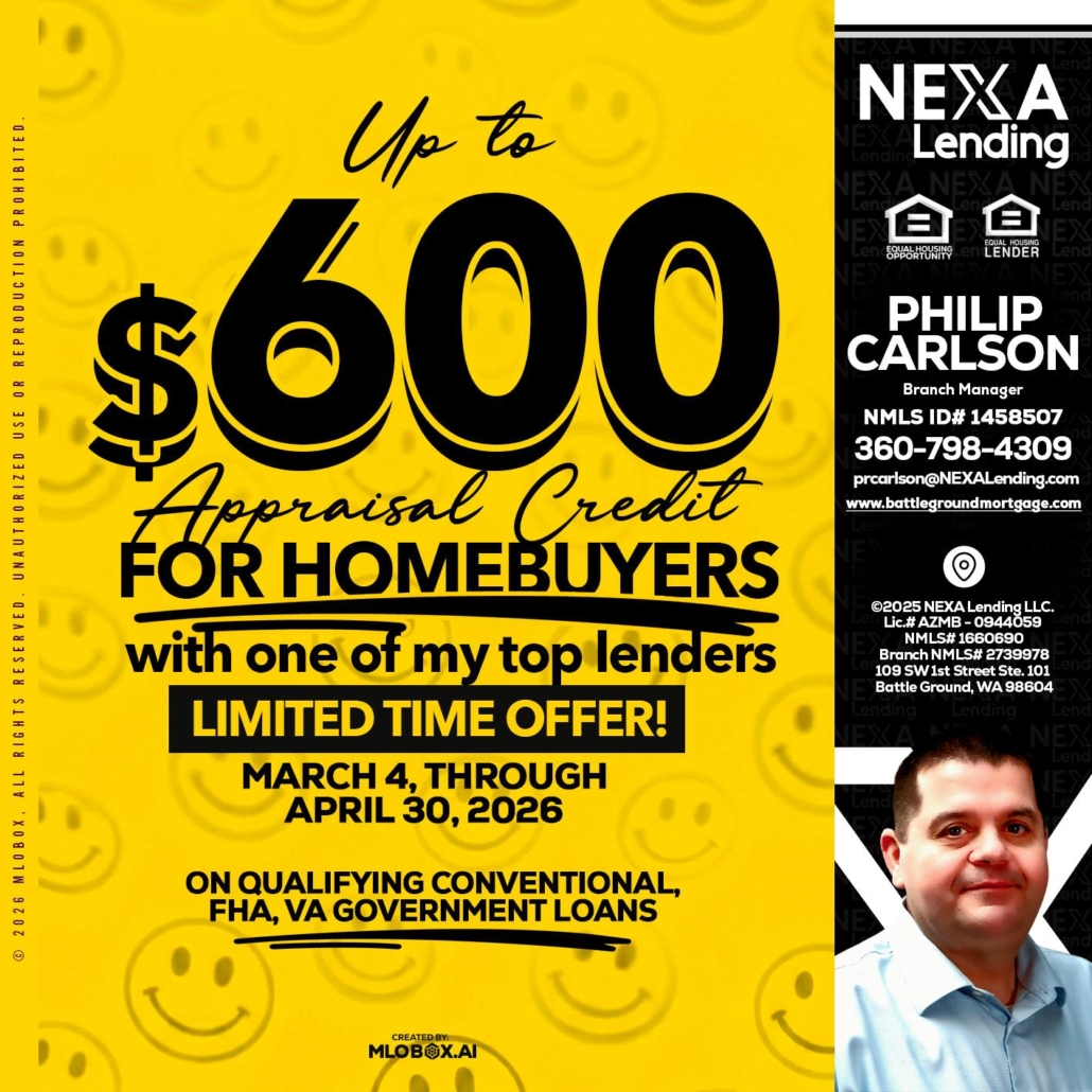 UP TO 600 - Philip Carlson -Branch ManagerHi, my name is Philip Carlson. I’m a Loan Officer with NEXA Lending LLC., offering personalized mortgage solutions, fast customized quotes, great rates and service with integrity.